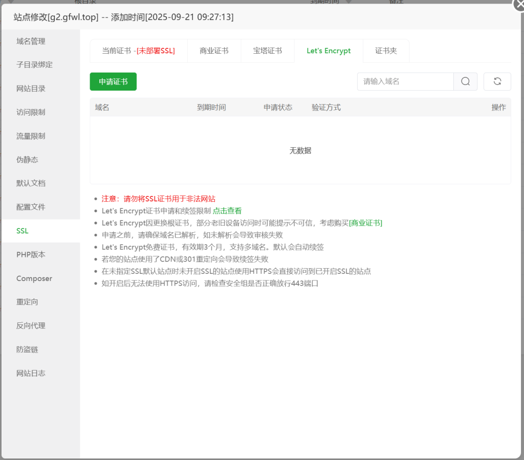 宝塔网站设置有免费90天的Let‘s Encrypt,到期仅需续签。